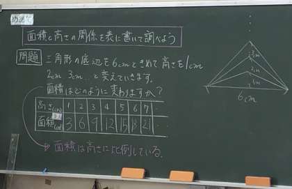 底辺が一定とすると、高さが上がるたびにどう変化するかを学んでいました。