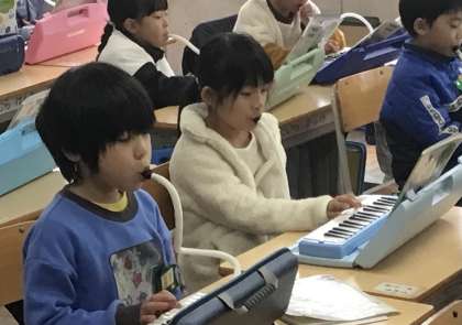 1年1組さん、音楽の授業でリズムに合わせて手を叩いたり、じゃんけんをしたり、鍵盤ハーモニカの演奏をしたりして楽しんでいました。