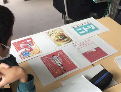 5枚の絵とキャッチコピーの書かれたプリントで話し合います。