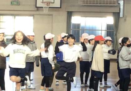 今日は風が強いので体感気温は低いです。風速1mにつき、1度体感気温は下がるそうです。そんな寒さにも負けず、元気に体育中です。