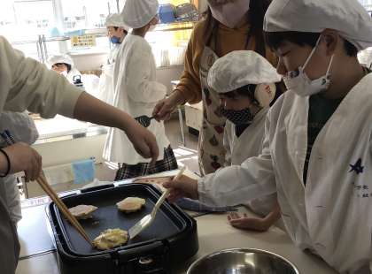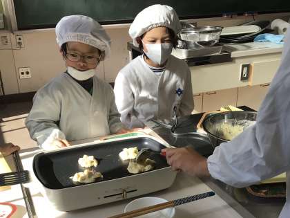 特別支援学級さんが2・3時間目にさつまいも入りのパンケーキ作りを行っていました。