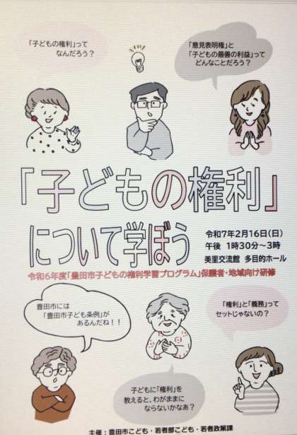 約1か月ほど先になりますが、2月16日(日)に美里交流館にて「子どもの権利について学ぼう」という講座が実施されます。