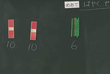 「10の束が2つと1が6本だね」と確認し、机の上に並べてみました。