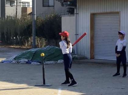 ポールの上にボールを置きますので、止まっているボールをバットで打ちます。