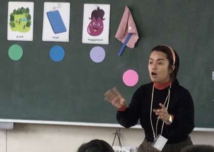 レッド、オレンジ、グリーン、ブルー、パープル、ピンクなど、色の歌をみんなで歌った後、チームに分かれてゲームをするみたいです。