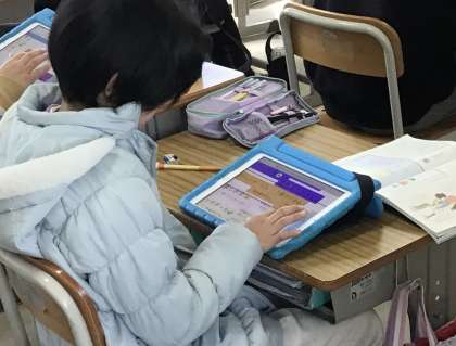 それぞれタブレットに自分の意見をまとめ、グループで発表するための準備中です。