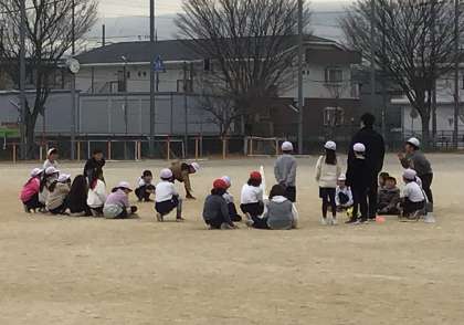 一番上の写真はキックベースのルールを確認している様子です。脩万先生が蹴る人の役をするので守備役の子たち「構えてね」と言われ、模範で守備位置についていた子たちがソーラン節の「構え」をしているところです。