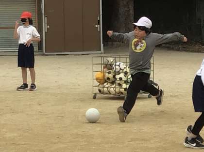 3年2組さんが体育の授業でサッカー(キックベース)をやっていました。