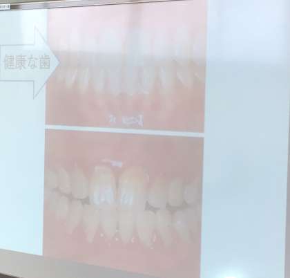 健康な歯とそうでない歯の映像を見比べ、歯肉炎や歯周病などの病気のことを教えてもらっていました。