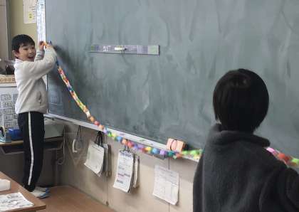 なんとビックリ 公開日 2025/02/21 更新日 2025/02/21 校長室から 6年生を送る会で使う飾り付けを繋げる2年生。 友達の作ったものとくっつけていくと、黒板の幅よりも広くなって、廊下まで達しました。 みんなビックリです。