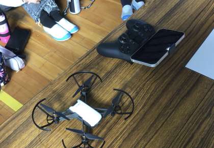 ドローンをゲームのコントローラみたいな機械で操縦します。