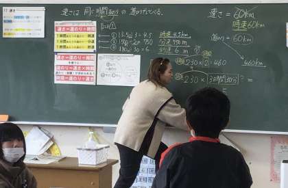 先生が「速さが時速だから、時間も分ではなく、時間で表すんだね」と言いながら、ラブラブマークをつけました(黒板、見えますか?)
