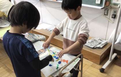 友達と協力して、2カ所で版画作りをしていました。