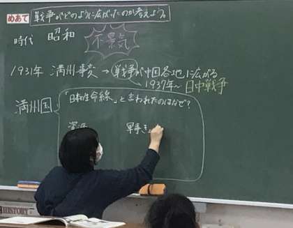 6年2組さん、社会の授業で戦争に突入した理由を考えていました。