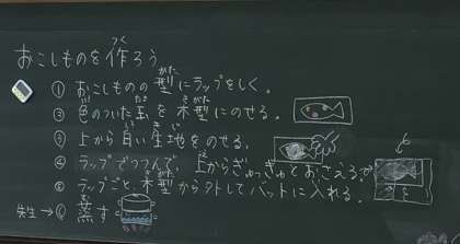 里奈先生の話を聞きながら、「おこしもの」の作り方を教えてもらっています。