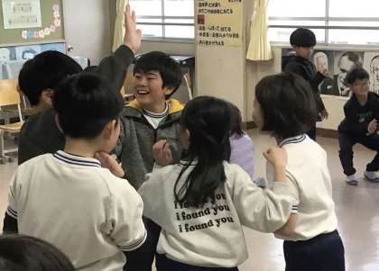書かれたお題に合わせて、言葉を使わずにジェスチャーで同じ班の子たちにヒントを出します。