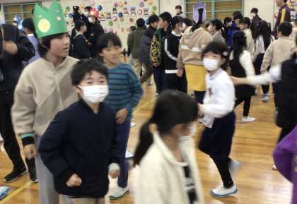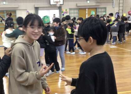 5年生の子たちが作ってくれた動画をもとに、教室で練習してきた踊りをしながら、じゃんけん汽車ポッポをしたり、ポーズを決めたり、6年生を囲んで丸を作ったりして、みんなで楽しみました。