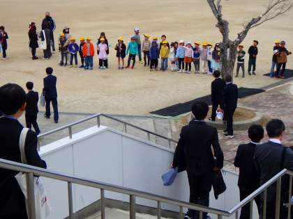6年生の子たちが3階から2階を通り、5年生、4年生に見送られ、昇降口にやってきました。靴を履き、外へ出ると、そこには小さな子どもたちが…。