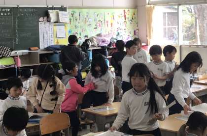 1年2組さんは教室内でプリントや教科書を配布していました。