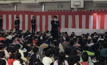 写真は「どんなことに気をつけらいいかな?」と全校のみんなに聞いている様子です