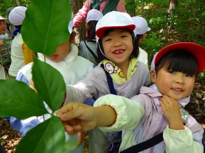 下の写真はトヨタの森で自分の顔ぐらいの大きさの葉っぱを見つけて喜ぶ2年生の子たちの様子です。