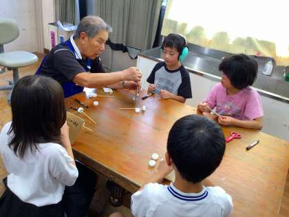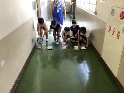 竹ひご、段ボール、ペットボトルキャップなど、身の回りにある物を使って、いかに速く、遠くまで走らせるかを考えて、クルマの作成をしました。