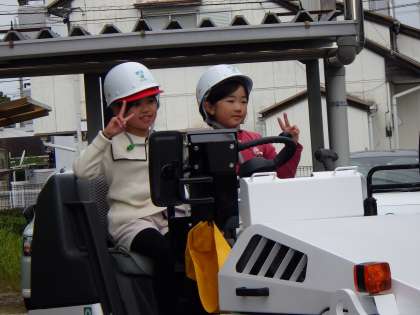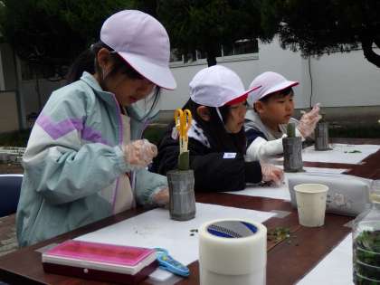 2年生、太啓建設の方が持ってきてくださった大型重機に座らせてもらったり、セメントを使った一輪挿し(鉛筆立て?)を作らせてもらいました。