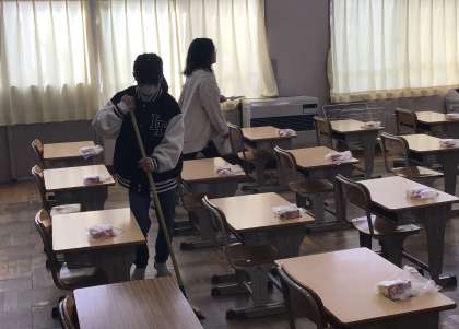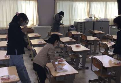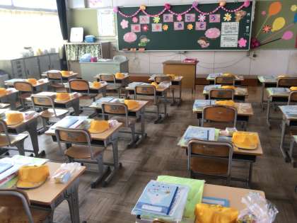 新1年生の教室は、6年生の子たちが掃除をした後、教科書、黄色い帽子などを全て机の上に並べてくれました。