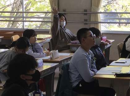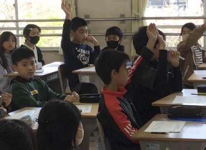 先生から昨年の取組を聞いた後、今年はじゃあ何を頑張るか、みんなの意見を聞いていました。