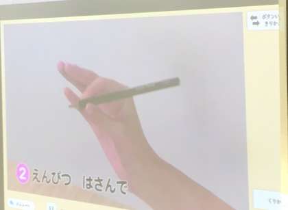 動画を見ながら、実際に自分のえんぴつを持ってみます。