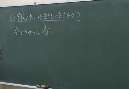 「生き物を探しに行く」そうですが、そもそも生き物ってなんだろう?を先生がみんなに聞きました。