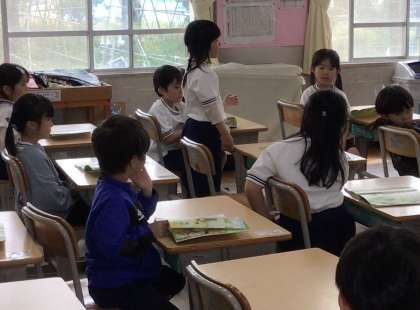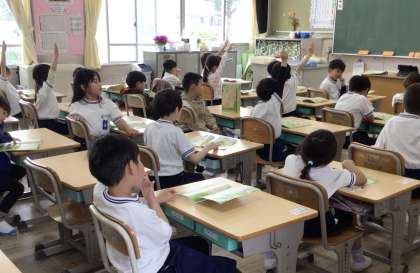 手をしっかりあげる子がとても多い1年2組さん。