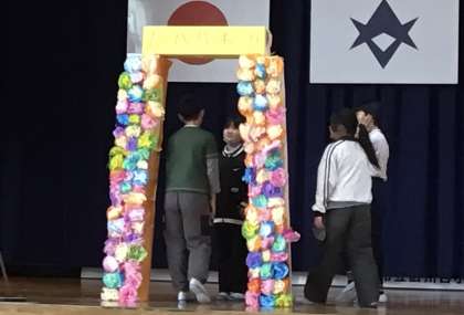 6年生の子たちが1年生を迎える会に向けてのリハーサルや会場準備を進めていました。