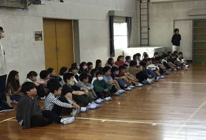 4年生の子たちが体育館後方で見学をしていました。