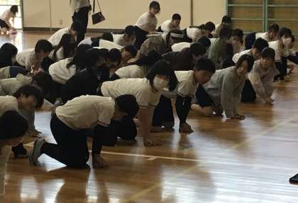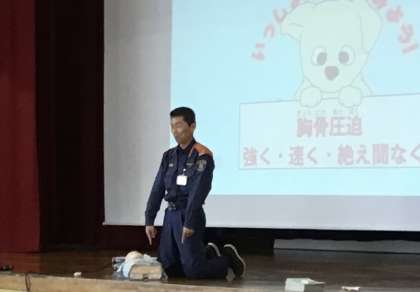 いよいよ胸骨圧迫のやり方を教えてもらいます。