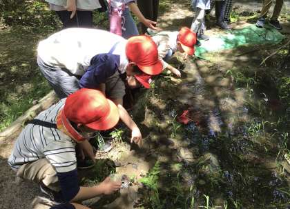 「どこ?」「どこ?」「いる?」落ち葉が沼の中にいっぱいあり、その下に隠れているお玉杓子が多くて、なかなか見つけられません。