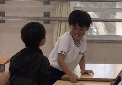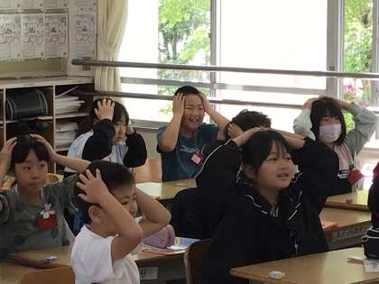 写真だと tired に磁石が斜めに貼ってあると思います。先生がこの言葉を言ったら、机の上に準備した消しゴムを取るというゲーム中でした。大きな声で先生の言葉に続いて、同じ言葉を発声します。