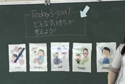sleep sad happy hungry tired 黒板に貼ってある気持ちを表す言葉。