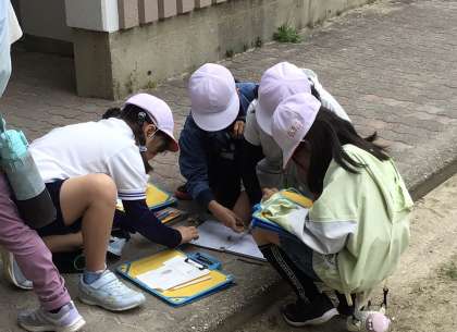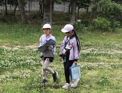 3年2組さんが理科の授業でルーペを使って、植物の観察をしに外に出ていました。