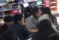 4年1組さん、2組さんが体育館でボール投げの練習中でした。