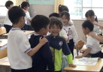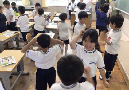 1年1組さん、「うたっておどってなかよくなろう」ということで、曲に合わせて踊ったり、ジャンケンしたりして、楽しみました.