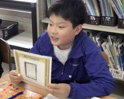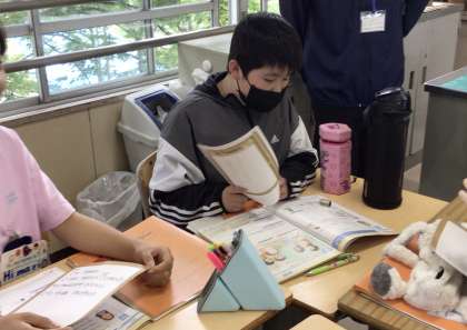 6年2組さん、英語の授業で「私の宝物」を班ごとに英語のスピーチで紹介する授業をしていました.
