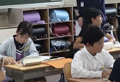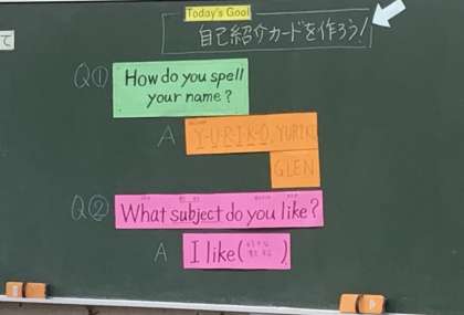 5年1組さん、英語の授業で「自己紹介カード」を作っていました.