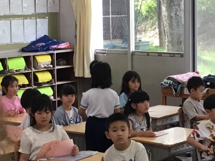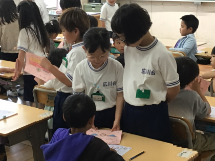 今朝、2年生の子たちが1年生の教室を訪れ、学校探検の招待状を渡しました。