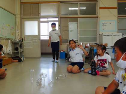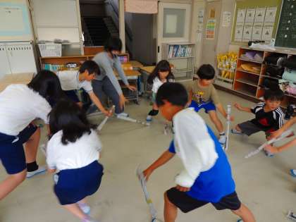 おなじみの「ふうせんバレー」「新聞落ちるなゲーム」等の人気遊びから、新たに「せーの」で息を合わせて新聞紙を丸めた棒をキャッチする「瞬間移動」や、命令と反対のことをする「反対信号」等、どれも楽しそうな遊びで、盛り上がっていました。
