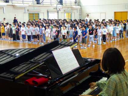 先生の伴奏で1年生から3年生の子たちで校歌を歌いました。