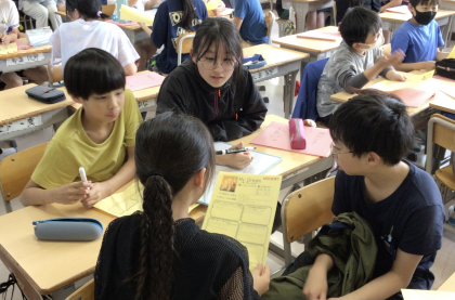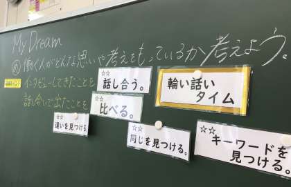 6年1組さんは、みんなの相談のもと「輪い話いタイムで話し合って、同じところ、違うところを考えて、キーワードを見つける」ことにしました。