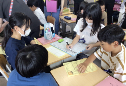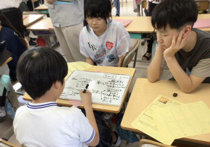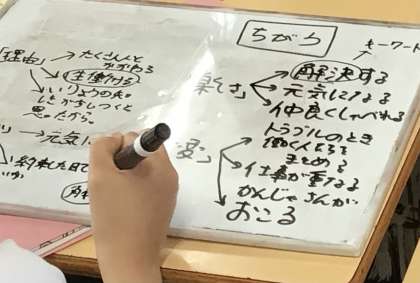 先生からは「ホワイトボードを使ってもいいよ」と指示がありましたが、すべての班が利用していました。班に1枚のホワイトボードだったので、ある班ではみんなの意見を書き出したら、学習用タブレットで撮影をし、すべて消して「おなじところ」「ちがうところ」「キーワード」をまとめようとしている班もありました。