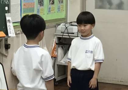 2人の男の子が前に出て、実際にみんなの前であいさつをしてみます.