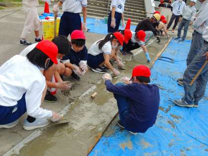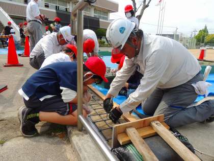 できたモルタルを、枠に流し込んだ後、平らにします。きれいに平らにするのは難しそうでしたが、職人のように上手な子もいて、「ぜひ、建設現場で働いてほしい」とスカウトされていました。